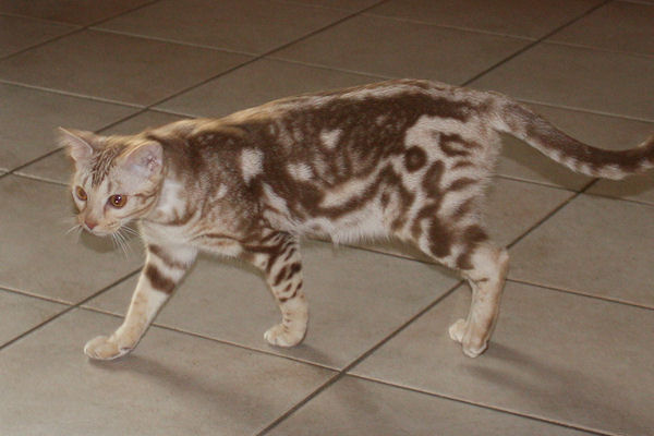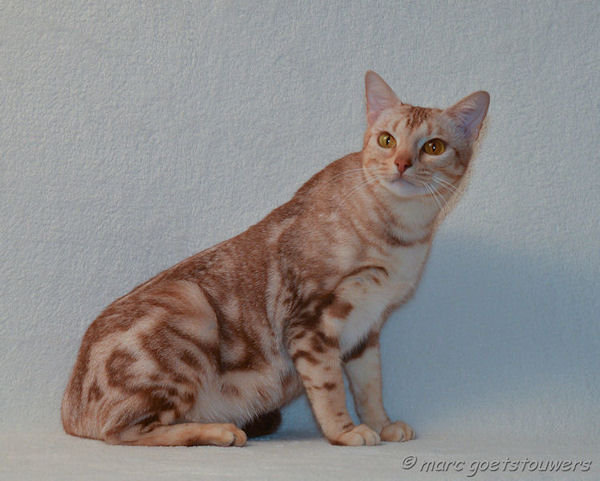 She is Sepia Marble Tabby of color. And she is a F2 Cheetoh.